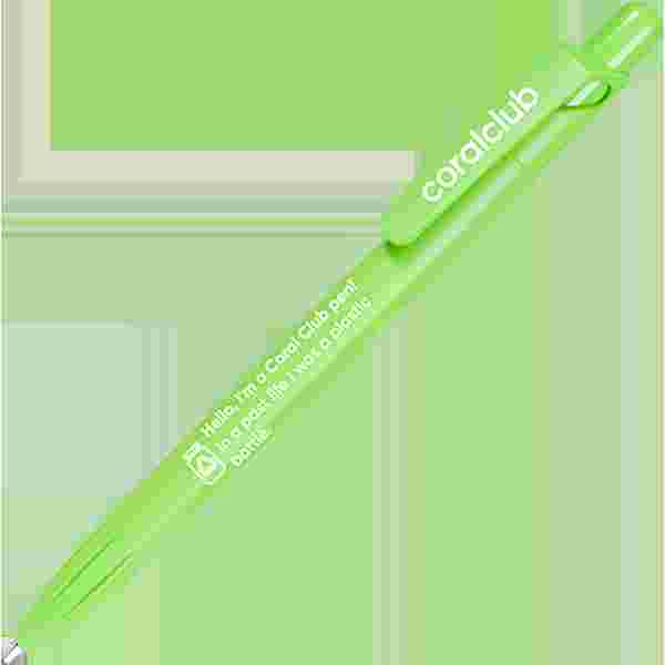 Pastapliiats nupumehhanismiga PET-RECYCLED materjalistс kirjaga "Tere, mina olen pastapliiats Coral Club! Eelmises elus olin plastikpurk".