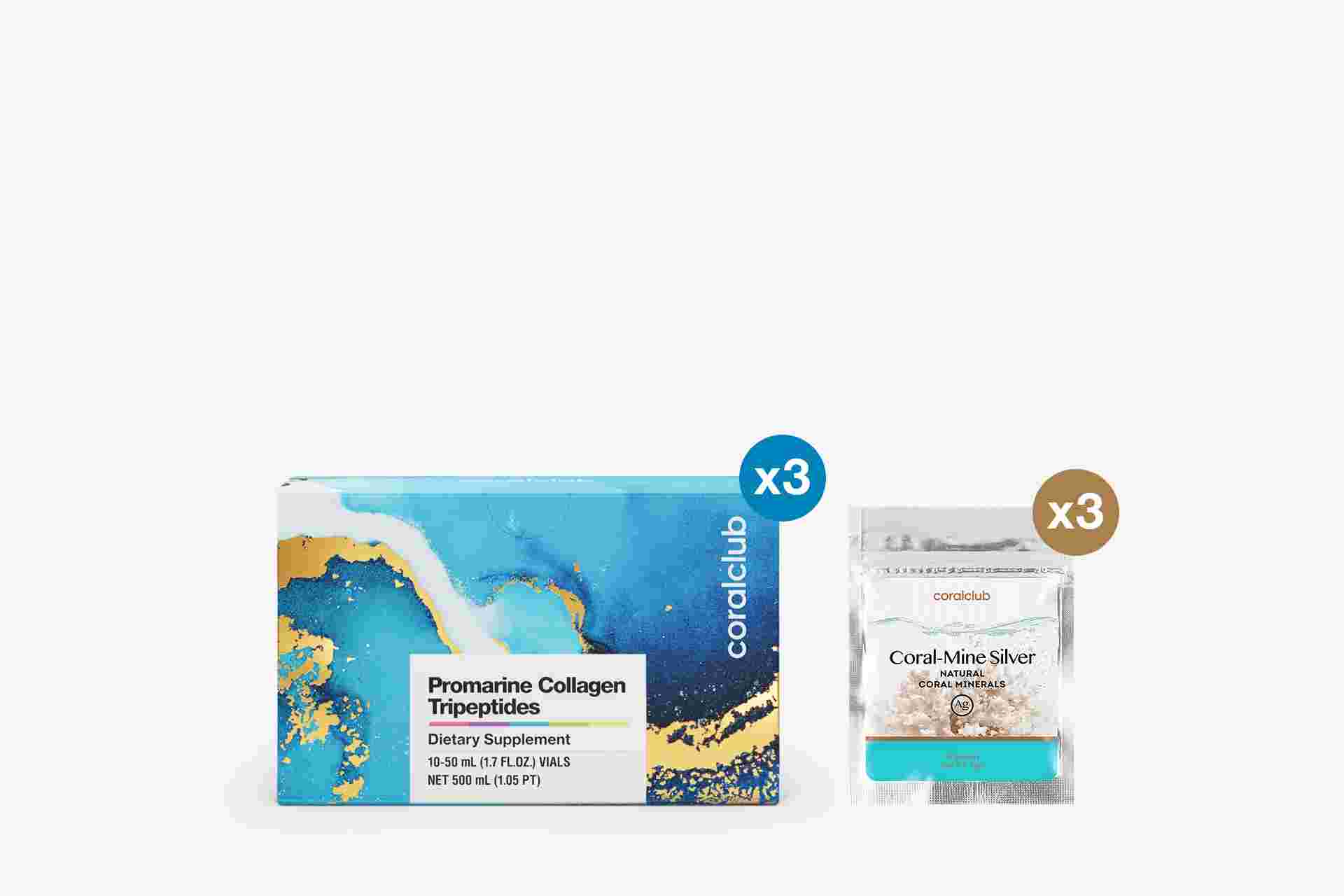Promarine kollageeni tripeptiidid (3 pakendit 10 pudeli kaupa (50ml): Hüdrolüüsitud vedel kalakollageen (sh Maxicollagen 3,5 g) 15 g, hibiskiõite ekstrakt (Hibiscus sabdariffa) 1,5 g, valge sõstra ekstrakt (Ribes rubrum) 700 mg, C-vitamiin (askorbiinhape) 100 mg, hüaluroonhape (naatriumhüaluronaat) 72 mg , B6-vitamiin 1,8 mg, B2-vitamiin 1,7 mg, spinat 1 mg, biotiin 50 mcg Coral-Mine (3 pakendit 10 kotikese kaupa): Purustatud korall, L-askorbiinhape